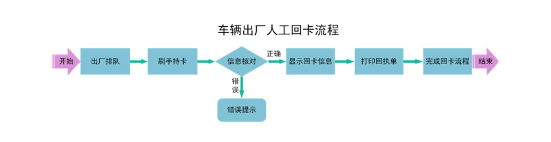 人工回卡:車輛司機(jī)將手持IC卡交給回卡工作人員,工作人員根據(jù)回卡軟件進(jìn)行信息核對(duì),確認(rèn)是否滿足回卡要求,在滿足回卡要求的條件下打印回執(zhí)單交給司機(jī),完成回卡流程。