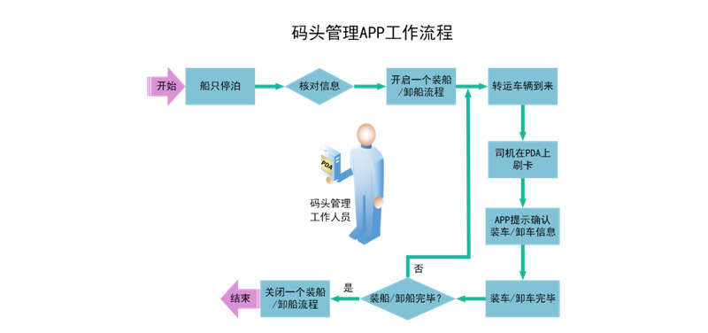 碼頭管理工作人員手持PDA管理裝船和卸船過(guò)程。車輛來(lái)到碼頭進(jìn)行物料的裝車或卸車操作來(lái)對(duì)物料進(jìn)行廠區(qū)內(nèi)的轉(zhuǎn)運(yùn)。碼頭管理APP既規(guī)范了裝車卸車過(guò)程,又起到了控制車輛流程的作用,是無(wú)人計(jì)量改造不可或缺的輔助系統(tǒng)。