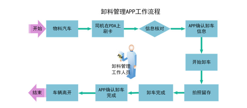 料場(chǎng)由工作人員手持PDA管理卸車過(guò)程。車輛來(lái)到料場(chǎng)卸料,工作人員要求車輛司機(jī)司機(jī)在PDA上刷手持卡,PDA顯示車輛相關(guān)信息,料場(chǎng)管理員根據(jù)顯示的信息判斷是否卸車,并且在卸車階段全程監(jiān)管。卸車完成后管控系統(tǒng)對(duì)該車的流程狀況行進(jìn)刷新。