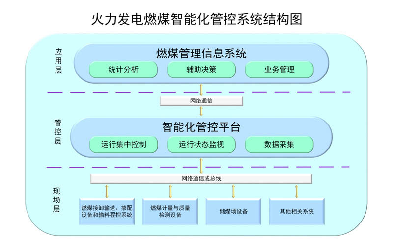 整個(gè)系統(tǒng)從結(jié)構(gòu)角度分為三個(gè)部分,現(xiàn)場(chǎng)、管控和應(yīng)用。燃煤接卸輸送與摻配、燃煤計(jì)量與質(zhì)量檢測(cè)、儲(chǔ)煤場(chǎng)設(shè)備設(shè)施布置在管控系統(tǒng)的現(xiàn)場(chǎng)層,智能化管控平臺(tái)布置在管控層,燃料管理信息系統(tǒng)布置在應(yīng)用層。